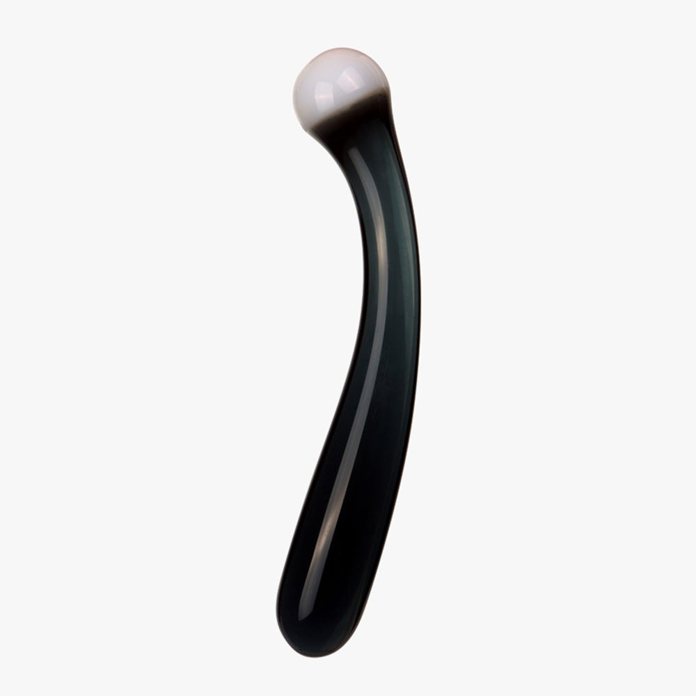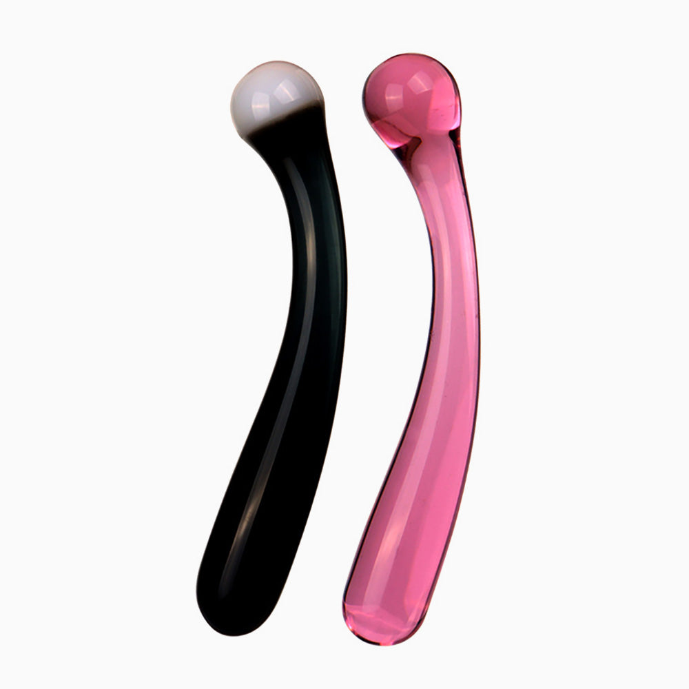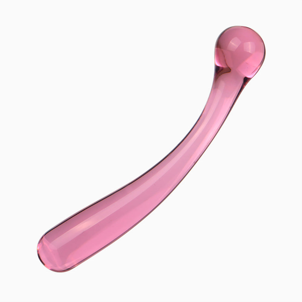 The Fairy Curved Glass Wand features a smooth, sleek body with two distinct ends for versatile play. One end is crafted with a rounded ball tip, while the other is tapered and smoothly cylindrical, allowing varied sensations in a single tool.