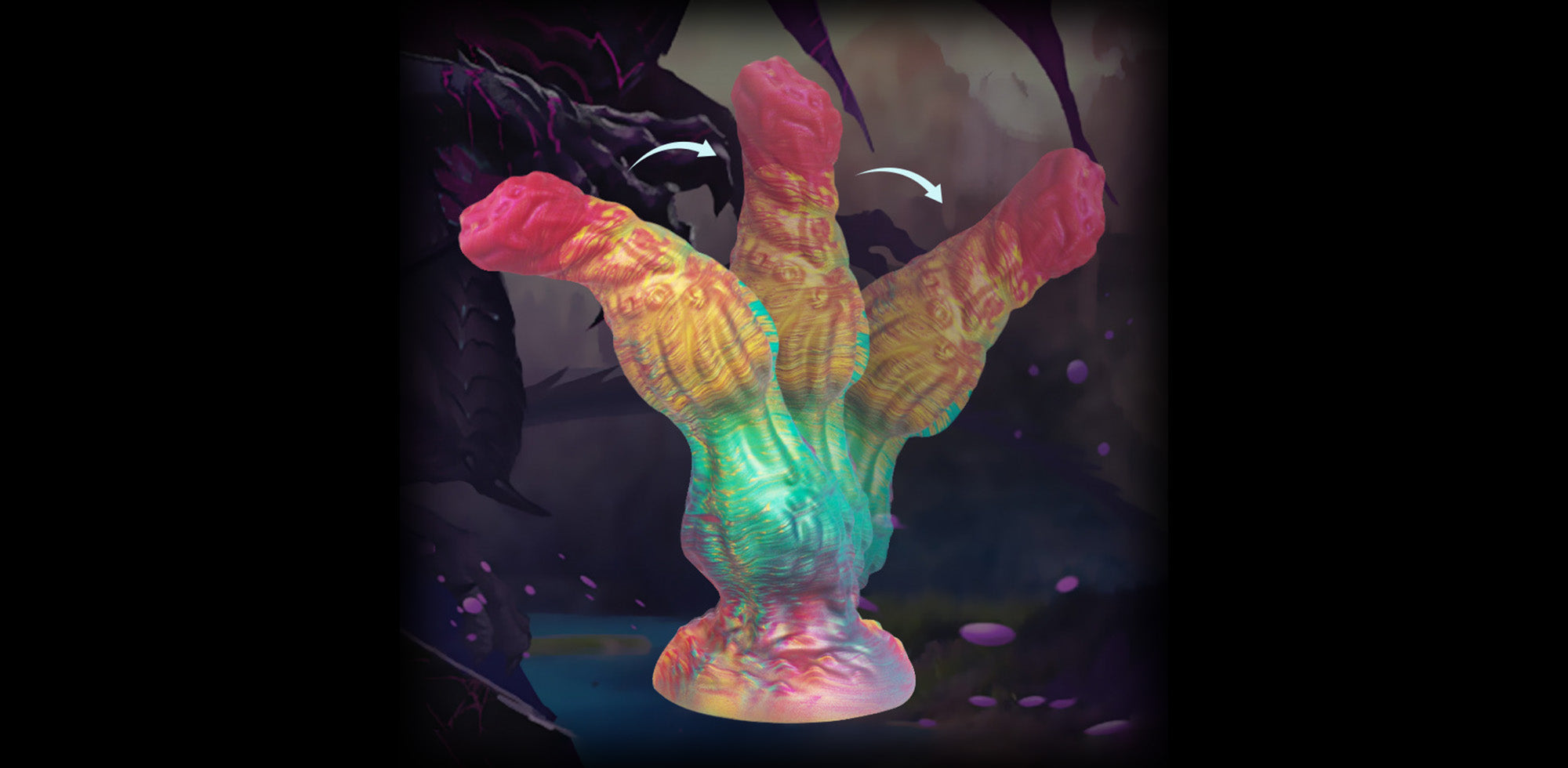 The Primal Double Knot Fantasy Dildo features a bold sculpted shaft with two pronounced knot-style bulges inspired by primal creature anatomy. A rounded head leads into the first raised knot, followed by a larger second knot that creates a gradual expansion for varied internal pressure and stimulation. The textured, organic surface and vibrant gradient finish enhance its dramatic fantasy appearance.